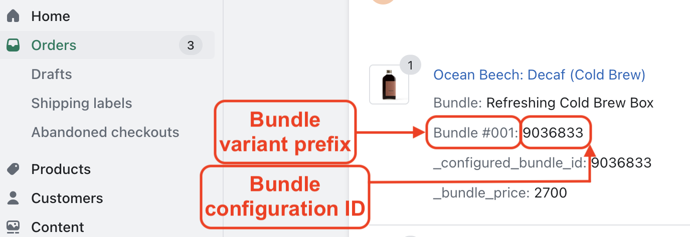 You will find the bundle variant prefix and the auto-generated configuration ID on an order page as shown below: