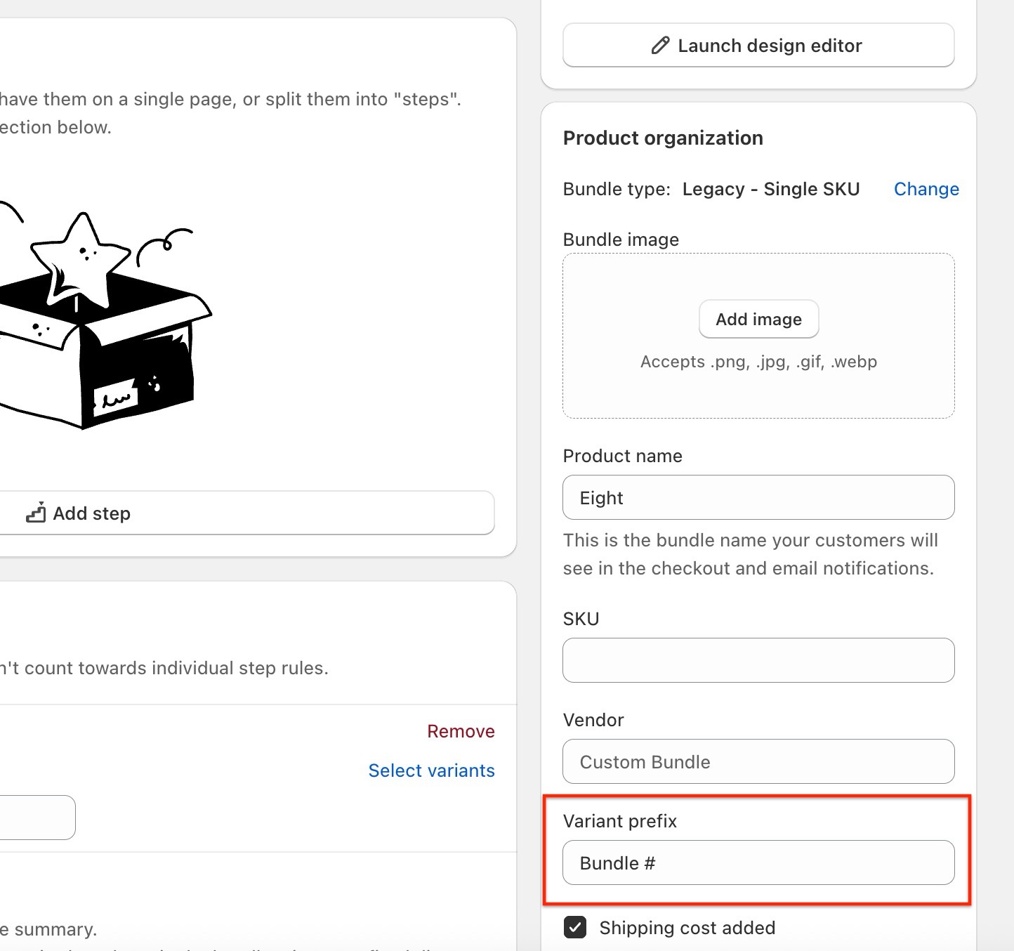 To help keep track of these specific bundle configurations, these identification numbers are preceded by variant prefixes - which you can edit to suit your store.
