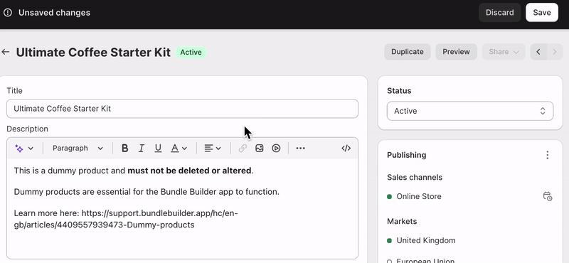 Tip: Remember to remove any direct links to Bundle URLs from menus, text, embedded images, announcement bars, etc. Customers who click direct links will still be directed to a non-functioning page.