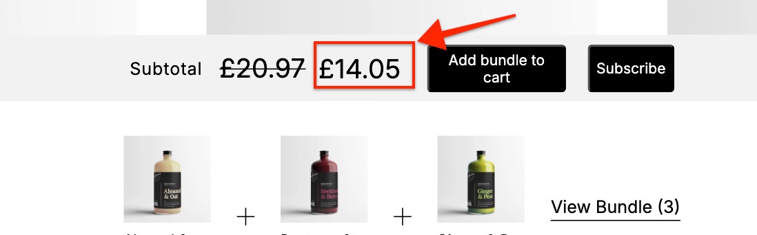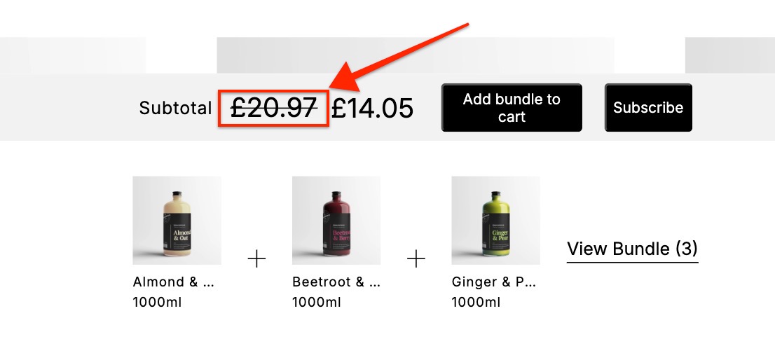 The bundle contents comparison price appears above the total bundle price. It shows the customer how much they would have paid if purchasing the same products outside of a bundle.